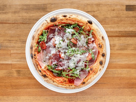 Pomidory San Marzano, mozzarella fior di latte, szynka parmeńska, rukola, pomidorki koktajlowe, Grana Padano D.O.P.