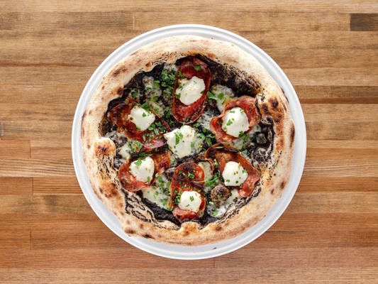 Pasta z czarnych trufli, mozzarella fior di latte spianata piccante, mascarpone, pietruszka